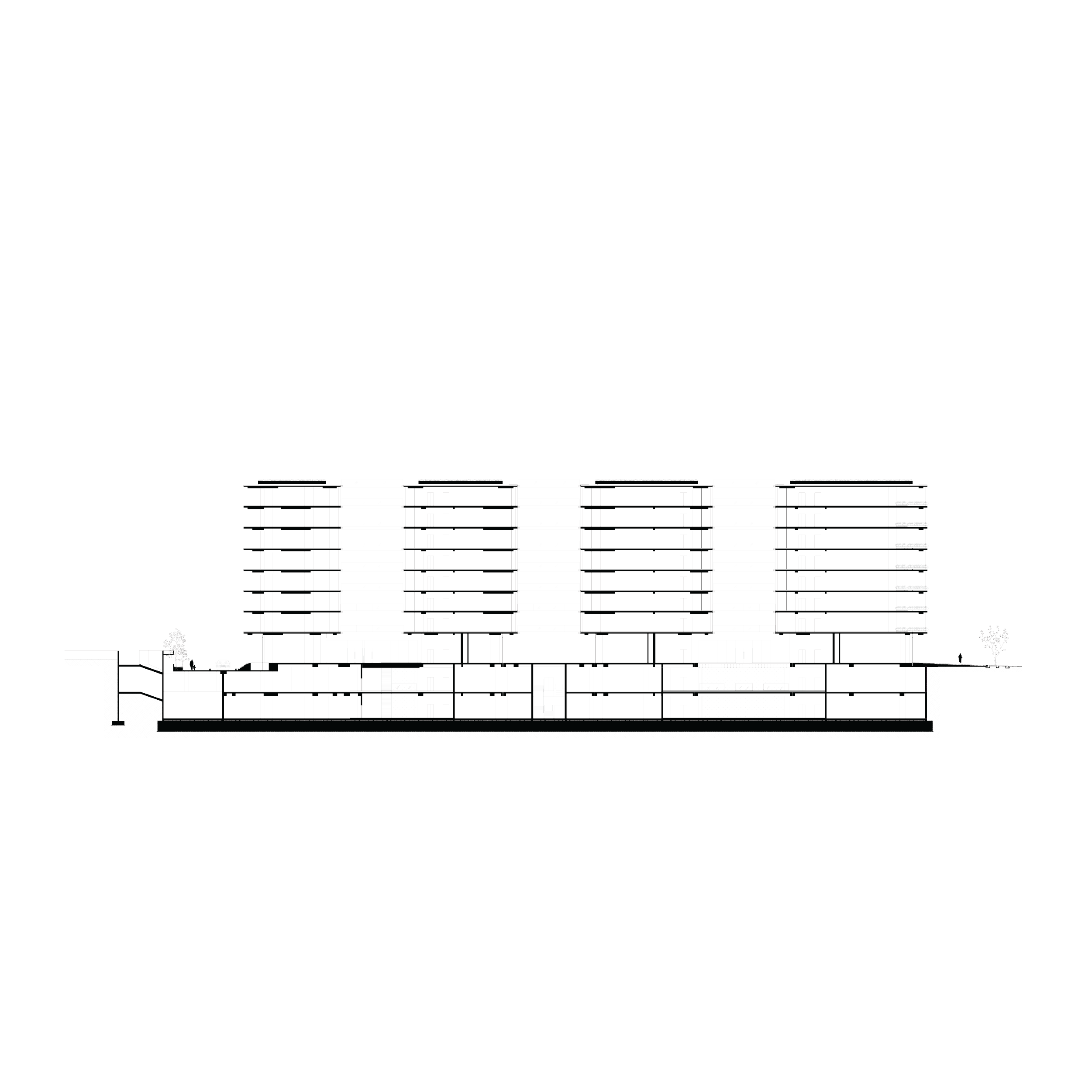 The building podium is treated with a detailed complex pattern in a single stone material in varying finishes and lends a minimalist formal character to the building and is a perfect setting for the dramatic colorful façade to follow above.