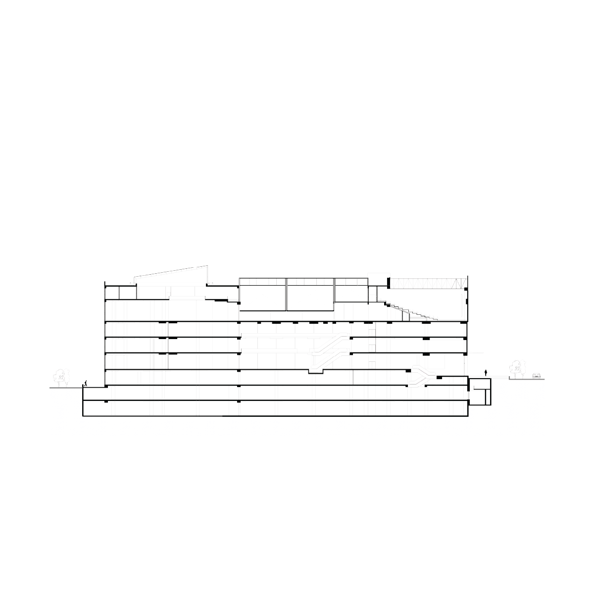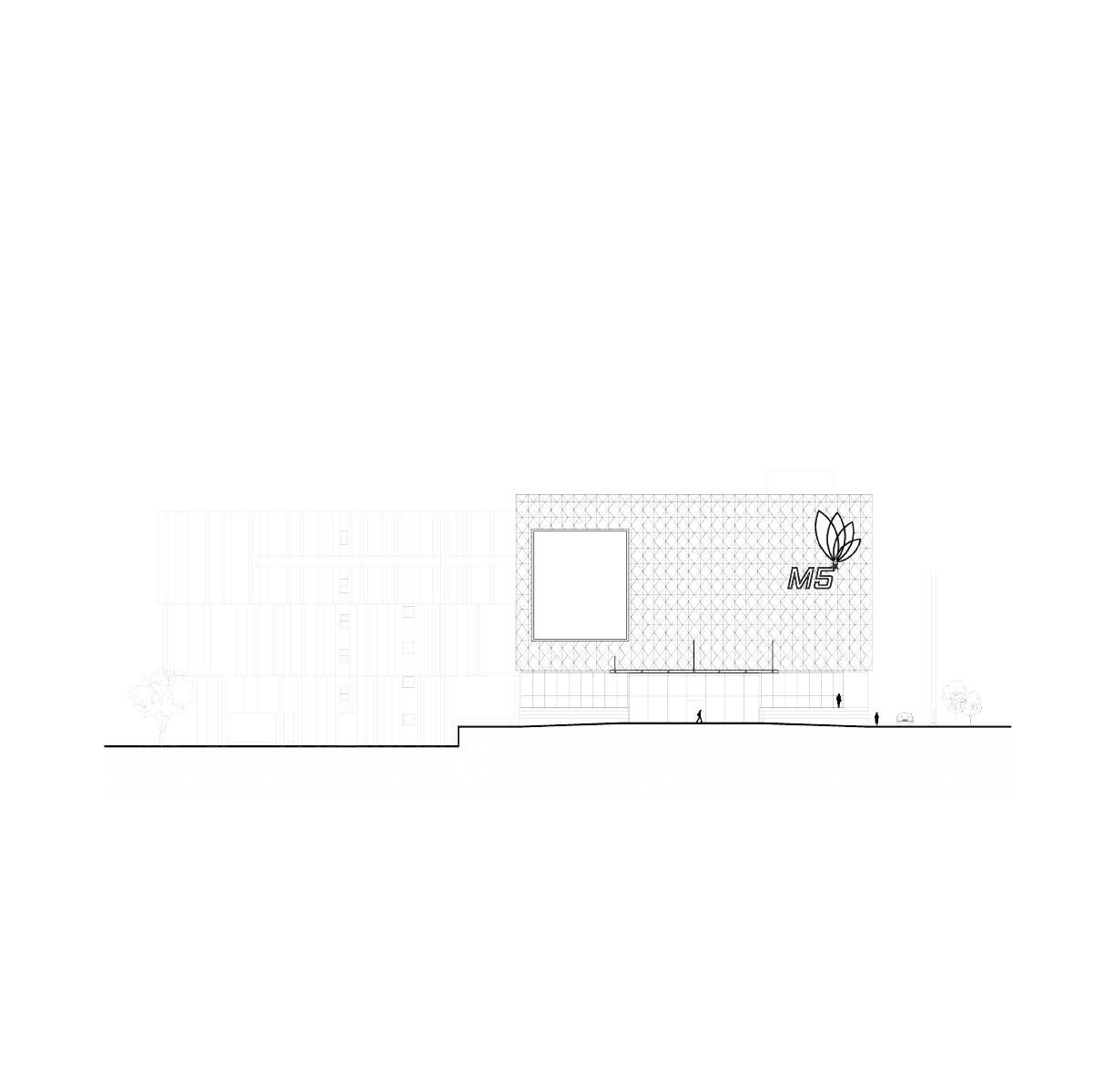The façade is patterned with a modular metal screen skin to exude an informal, industrial, futuristic appeal, allowing flexibility in signages and branding. This feature exemplifies the dynamism of a retail center which is continued with vertically patterned painted walls on all sides.