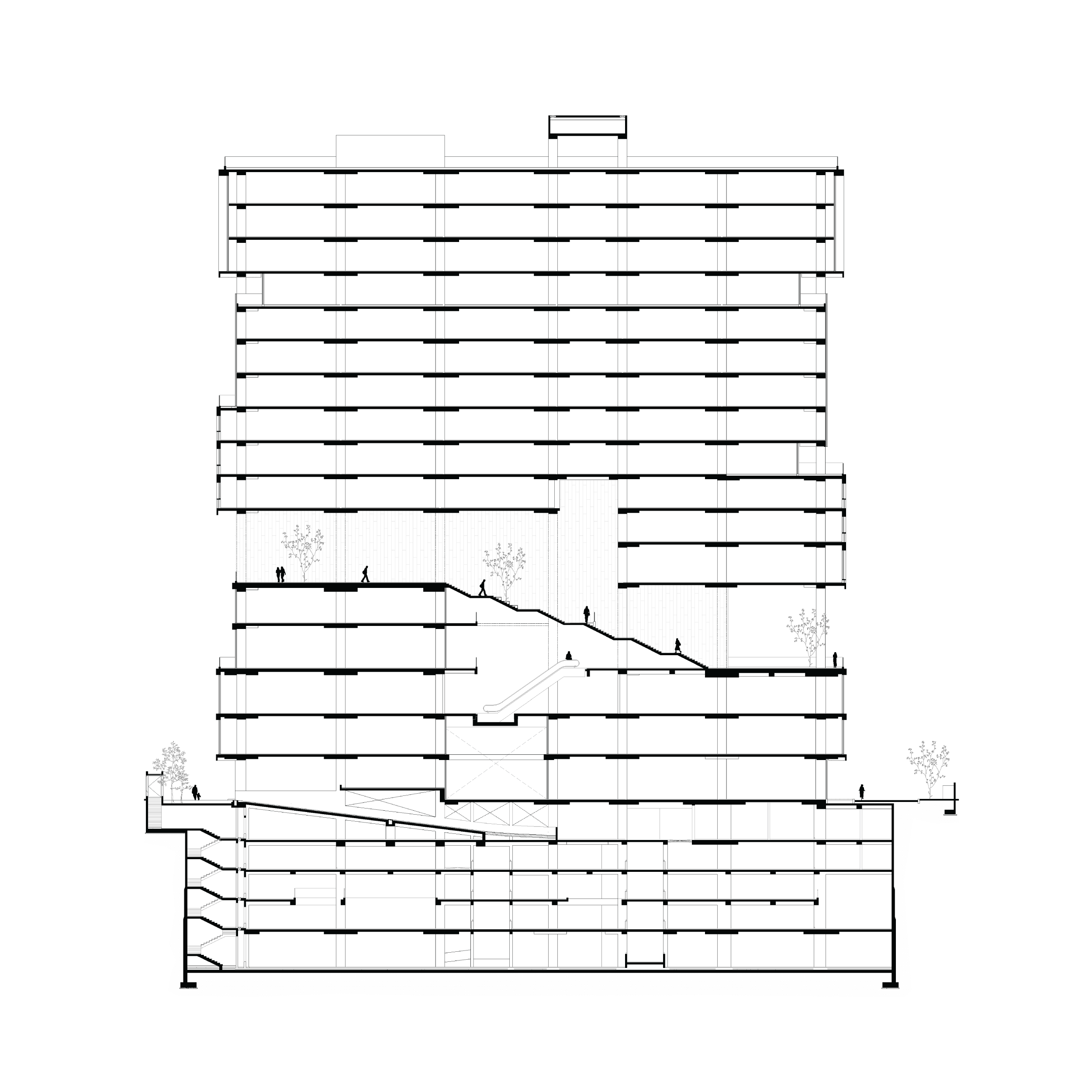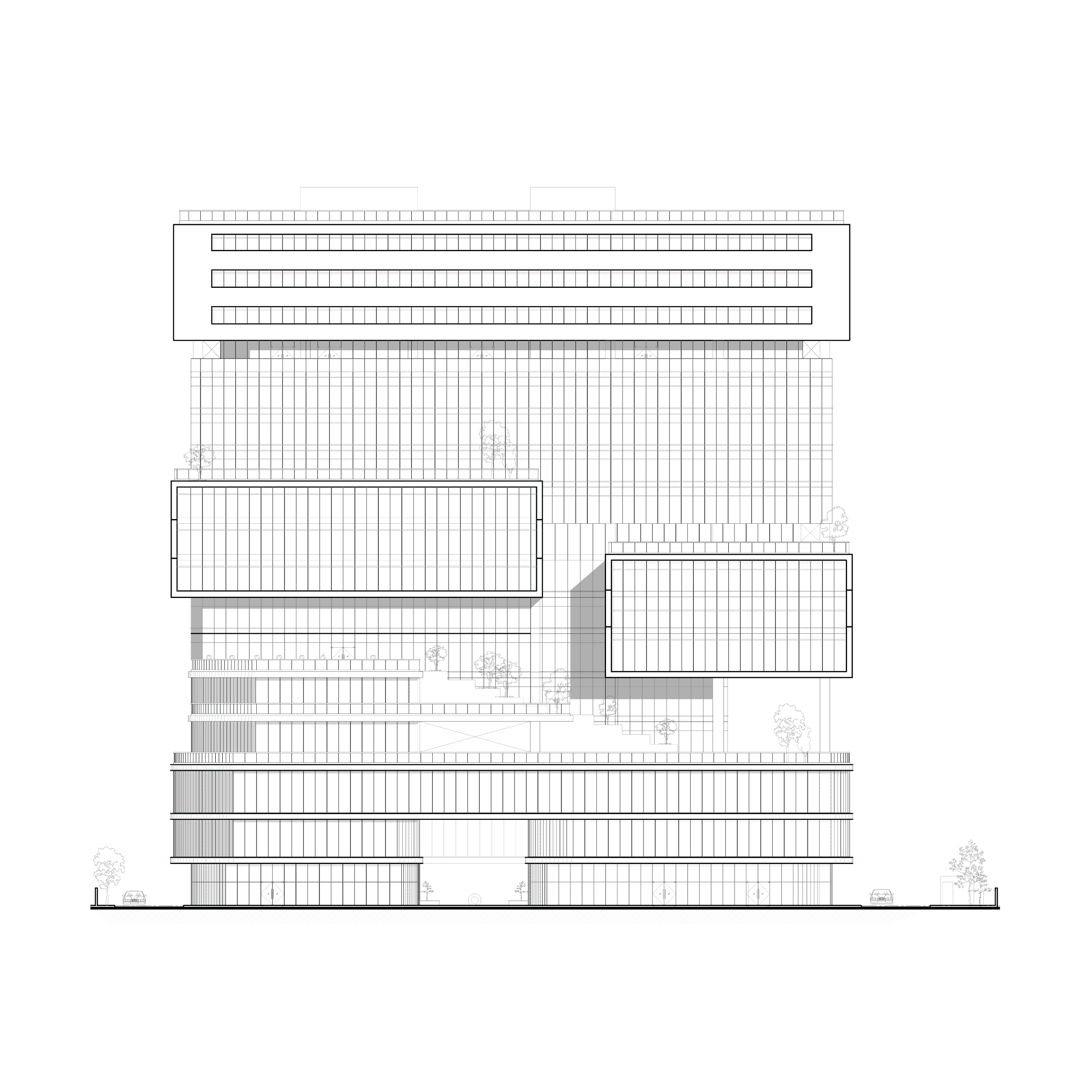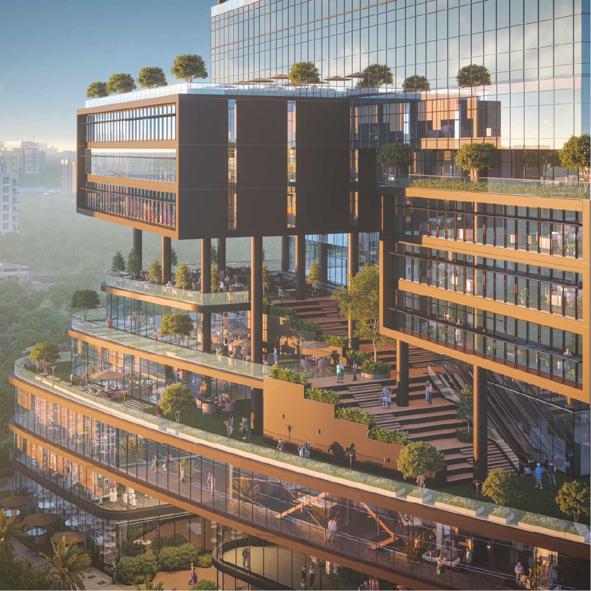 It has a retail segment of stores and restaurants on its first three levels leading to a corporate club at its fourth and followed by multiple office floors above in varying compositions. The façade is broken into segments appearing as a composition of carefully arranged rectangular blocks over one another and moving inwards and out from the main façade. The resultant recesses create terraces and voids, self-shading large parts of the façade and opening views to the outside.