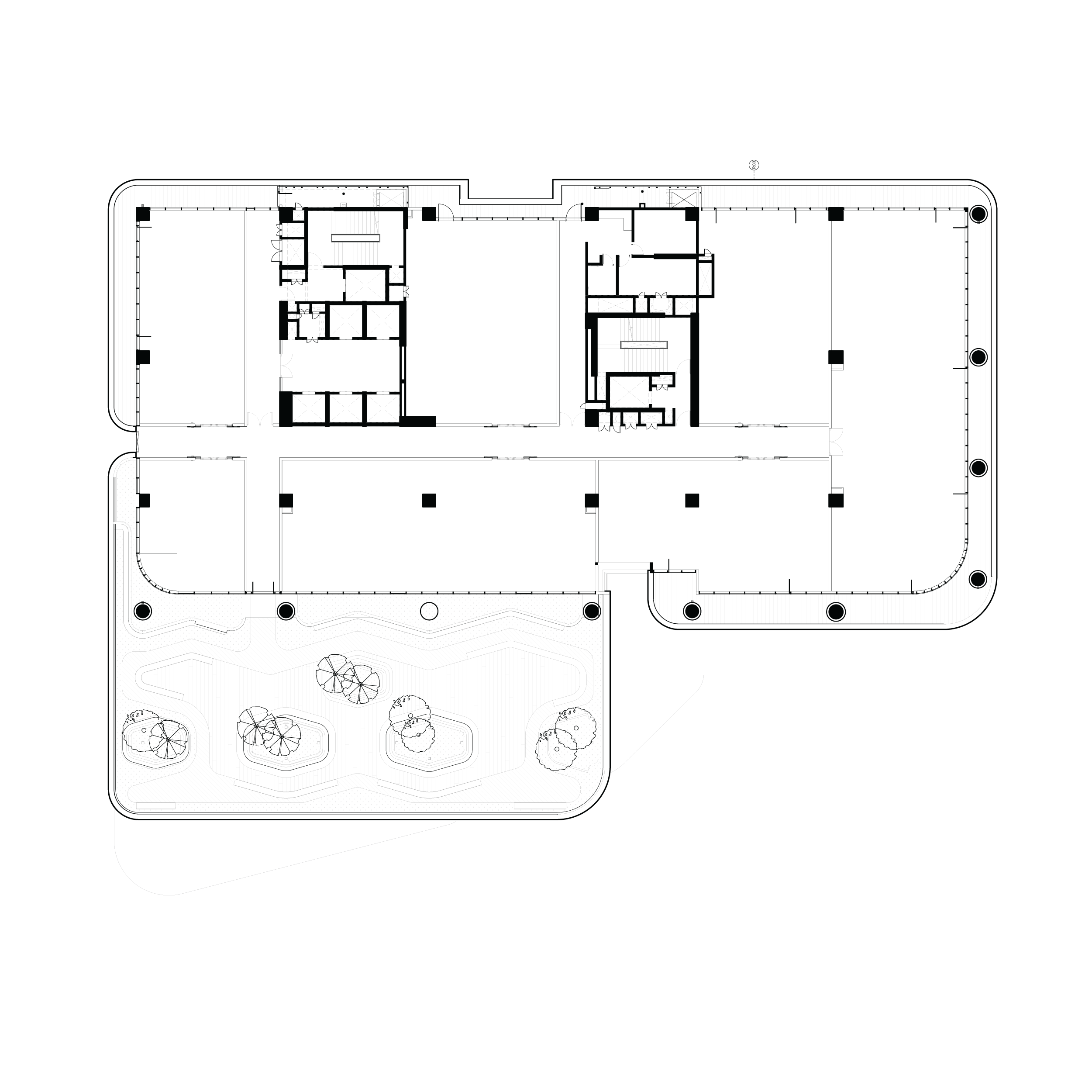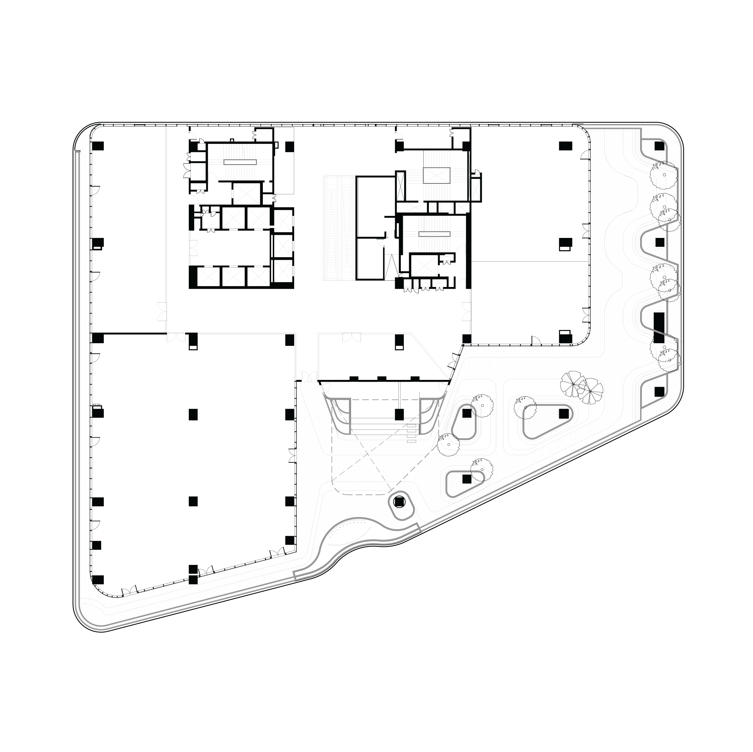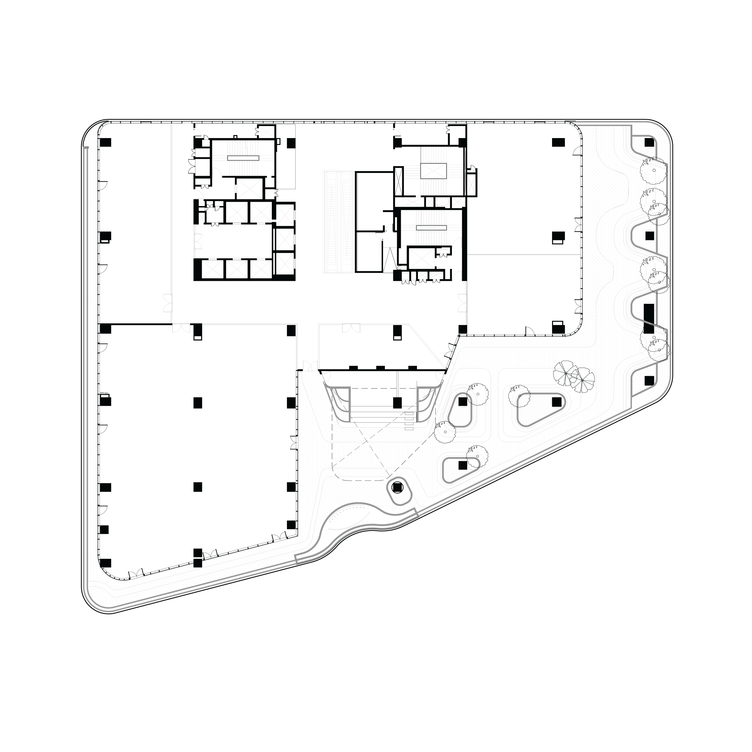 It has a retail segment of stores and restaurants on its first three levels leading to a corporate club at its fourth and followed by multiple office floors above in varying compositions. The façade is broken into segments appearing as a composition of carefully arranged rectangular blocks over one another and moving inwards and out from the main façade. The resultant recesses create terraces and voids, self-shading large parts of the façade and opening views to the outside.