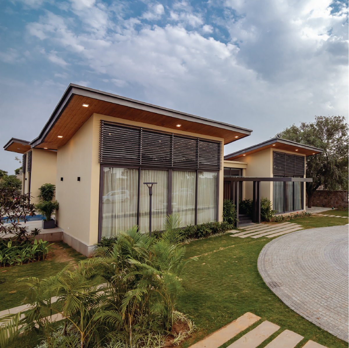 The design has farmhouses in varied configurations of plots and amenities, while being connected to an activity center at its core. The design of the homes and the landscape is minimal and focuses on the outdoor experience of gardens, walks and parks. The project uses indigenous plantation and local building materials adopting them in a contemporary form.